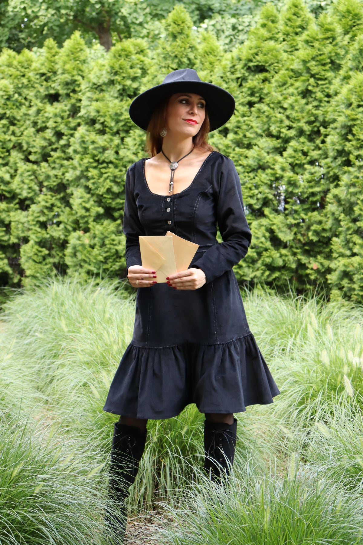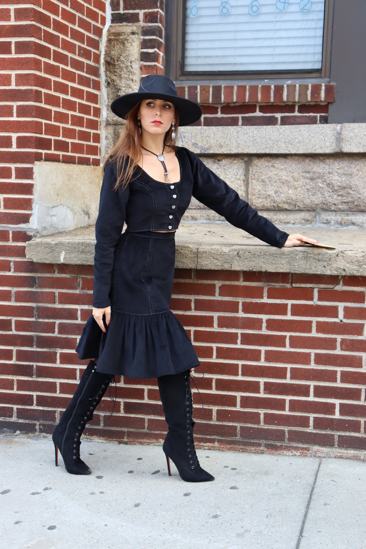 Jesse James was an outlaw, a train and bank robber and the leader of a notorious gang! Jesse just couldn't get enough! Tata can't get enough of crop jackets and our Jesse James Crop Jacket shows you why.  When a jacket hits your waist, you immediately look more feminine and more shapely! Ours is made of pinwale corduroy, has silver topstitching and is fully lined. The fabulous silver colored heart buttons with etched detail were a special find and it features a scoop neck and slim fitted sleeves. Wear it with our matching Jesse James Skirt or even a pair of jeans and you'll lead the pack!