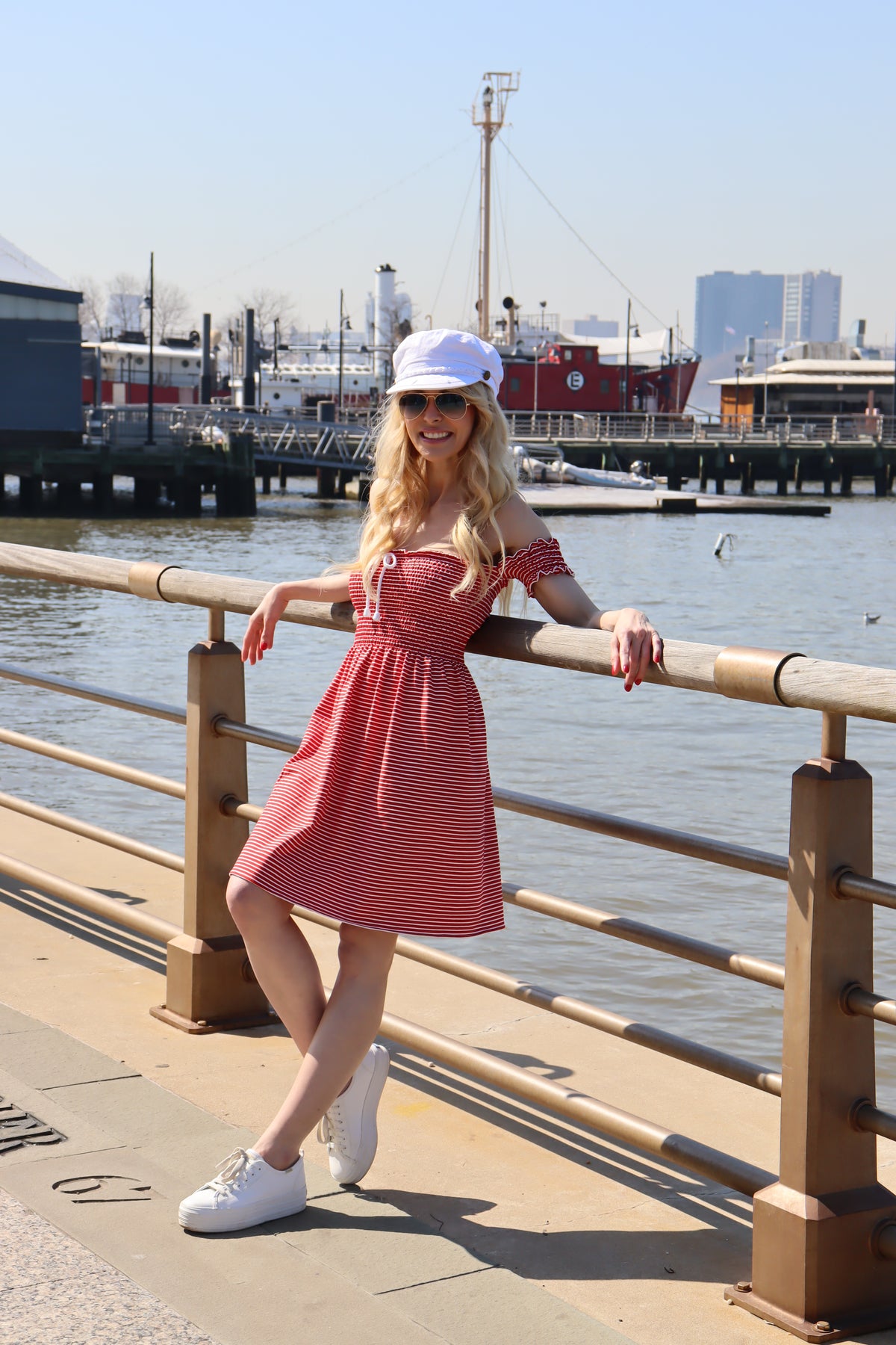 Tata’s mother, Ruthie, had this little red and white striped shirred dress in the 1960's which she then gave to Tata, who wore it in the eighties, nineties, and beyond! She brings it back in Ruthie’s Love Boat Dress. It’s the perfect sun dress - for the beach, dressed up in heels, or worn with a flat! Tata just loves this dress. You’ll love it too! 95% cotton, 5% Lycra. Sewn in the U.S.A.