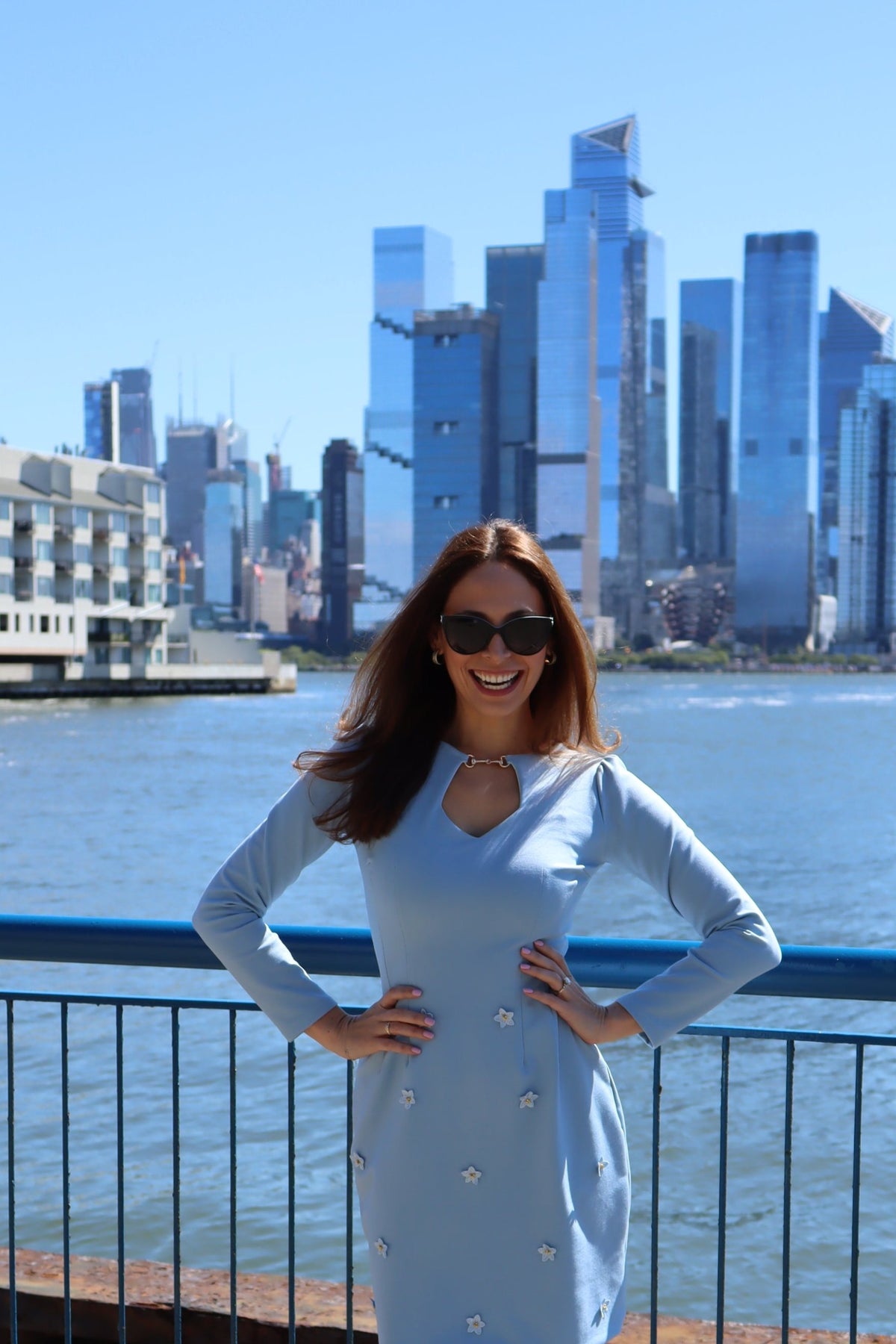 Our dreamy Light Blue Ponte de Roma dress has elegant long sleeves, a cutout neckline, gold hardware at the nape and dreamy floral appliques handsewn with gold beading at the centers. Wear it to a high profile meeting, out to a fine restaurant or to any dressy affair, you'll look heavenly! 100% polyester and fully lined. Sewn in the U.S.A.